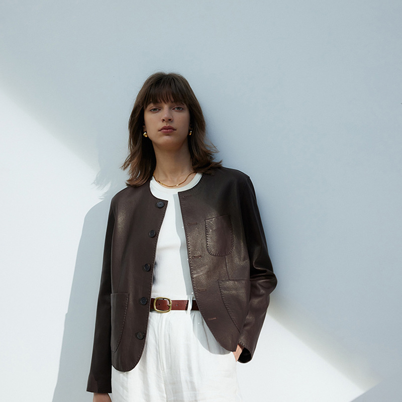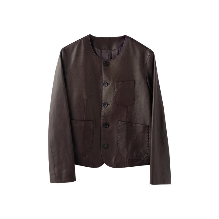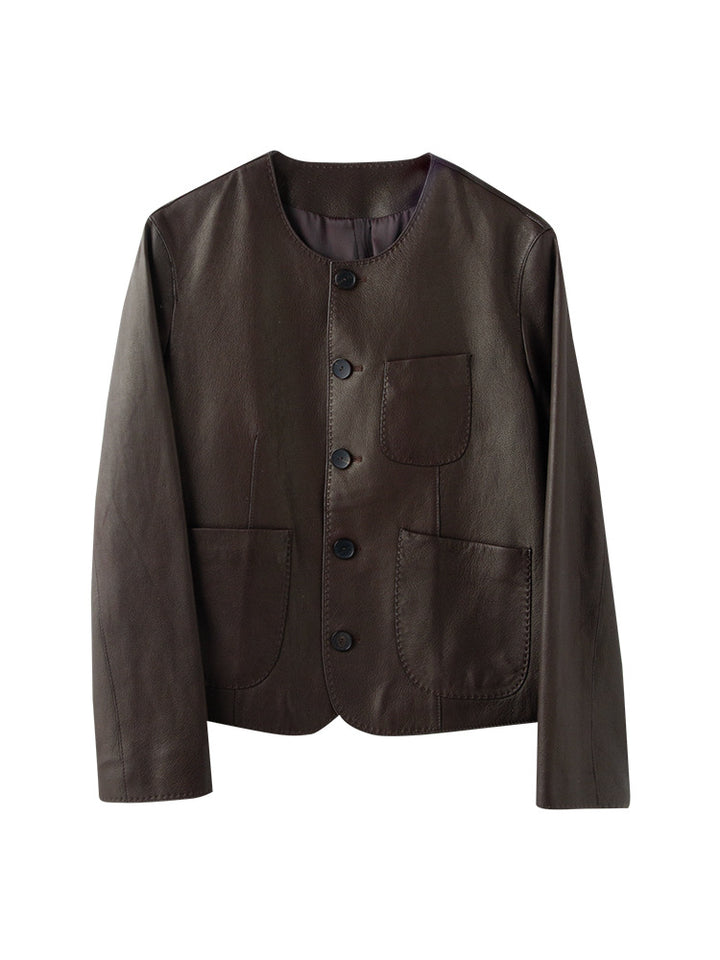 Casual Genuine Leather Clothes Women's Short Jacket Sheepskin Round Neck